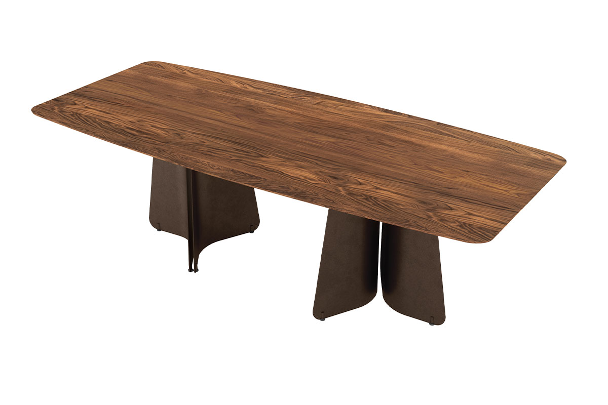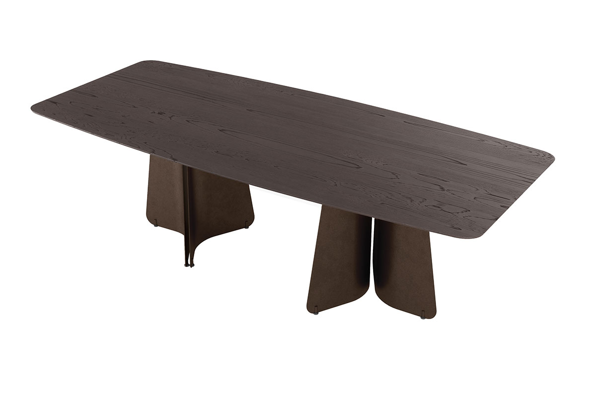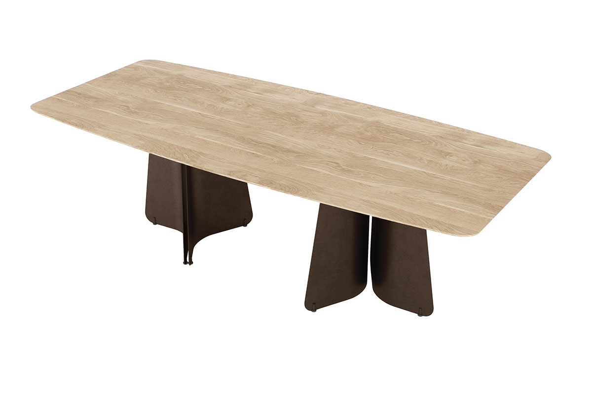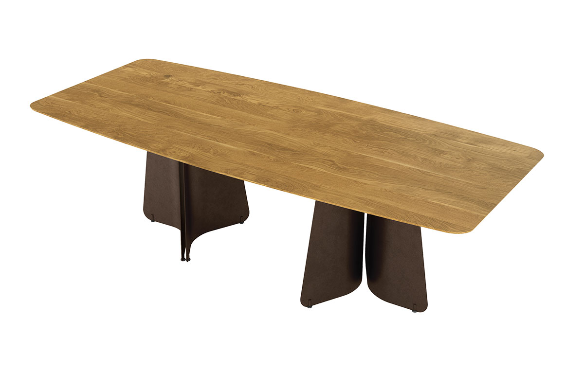 Die filigran anmutende Vollholztischplatte mit präziser Schweizer Kante scheint über dem skulpturalen Stahlgestell zu schweben. Diese visuelle Leichtigkeit steht im spannungsvollen Kontrast zur tatsächlichen Materialität: massives Holz, getragen von gebogenen Stahlwangen. Das Zusammenspiel aus Schwere und Eleganz verleiht Maona seine architektonische Klarheit und zeitlose Ausdruckskraft.